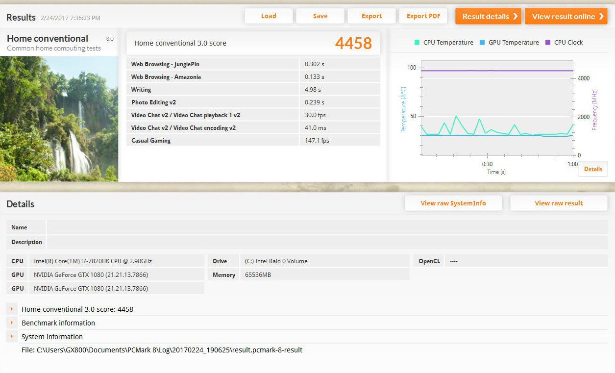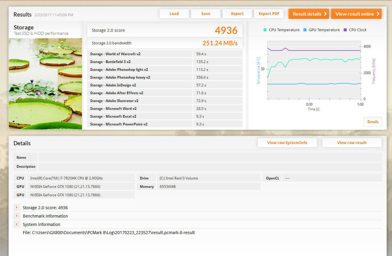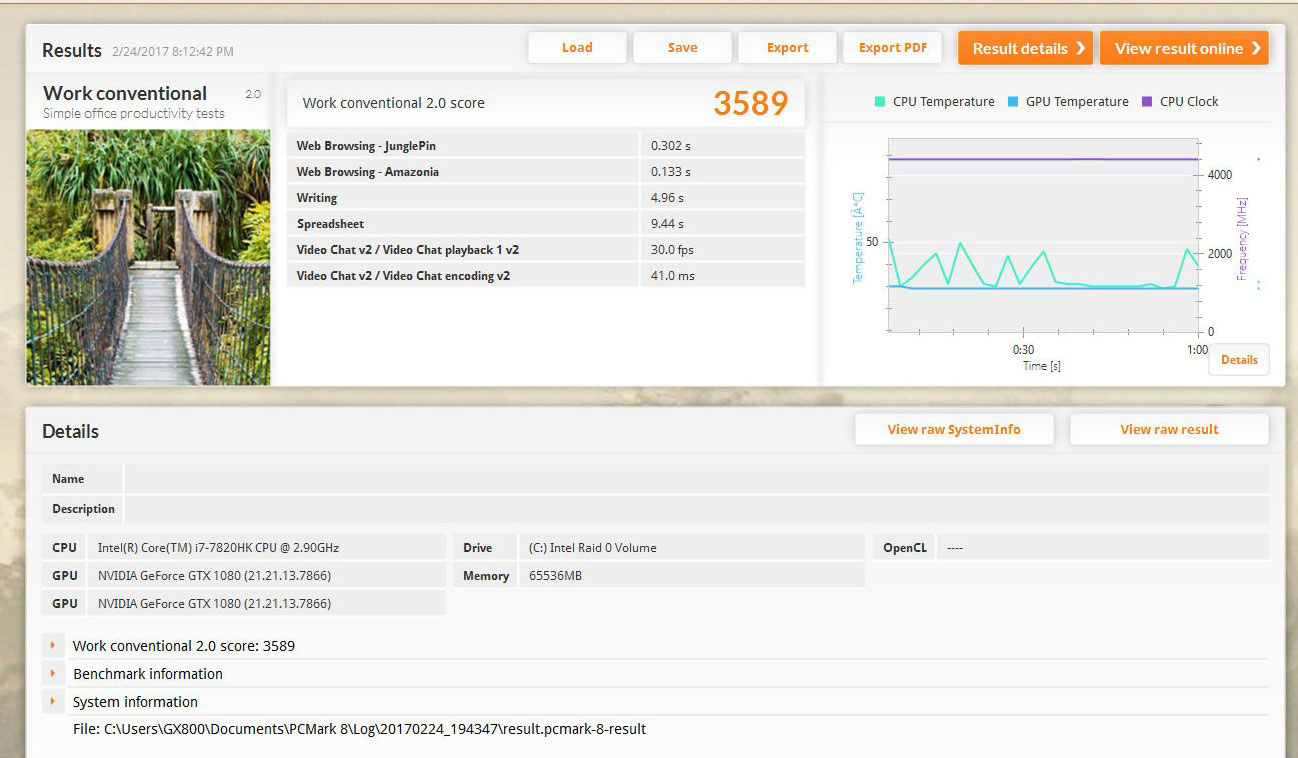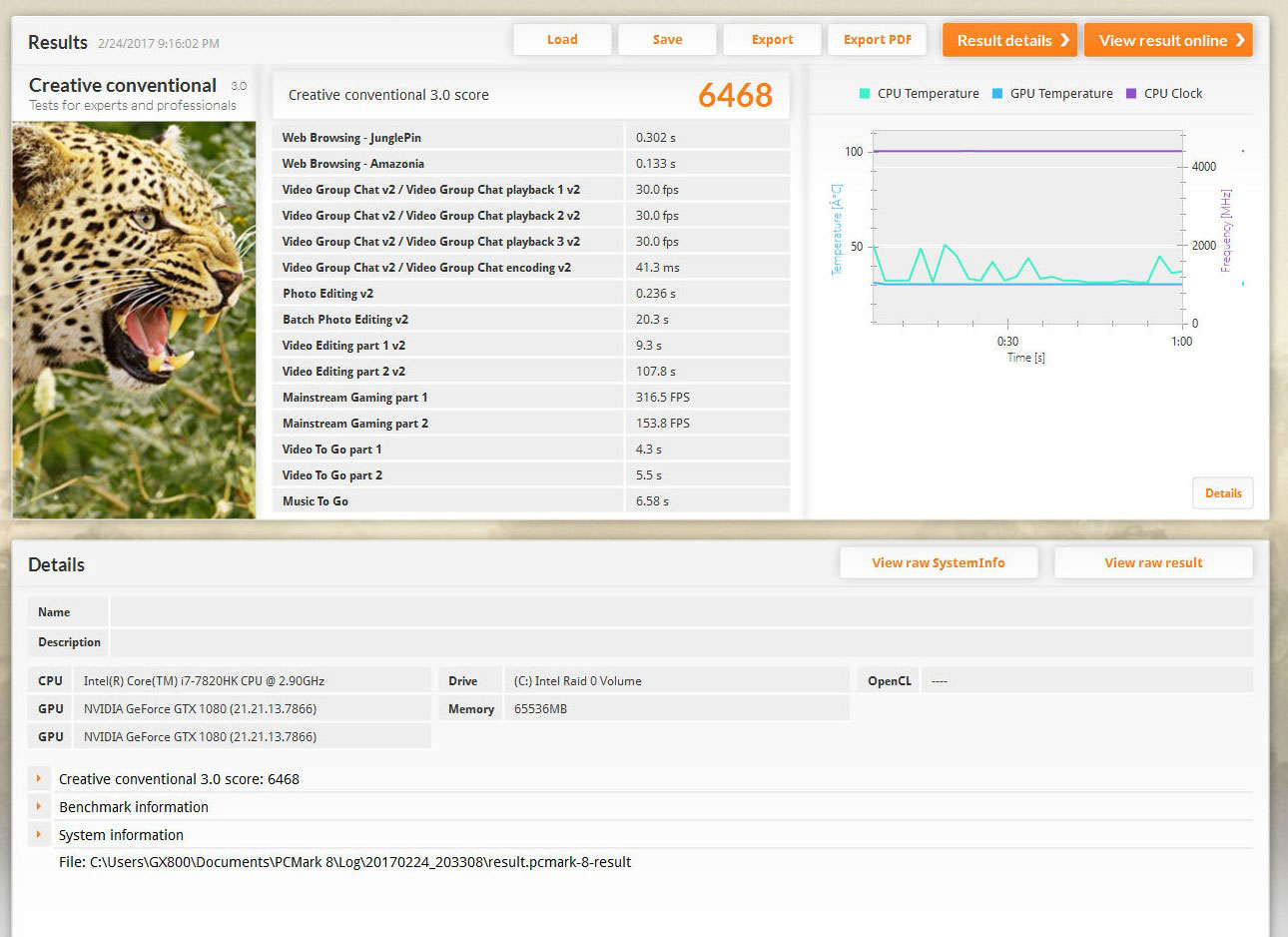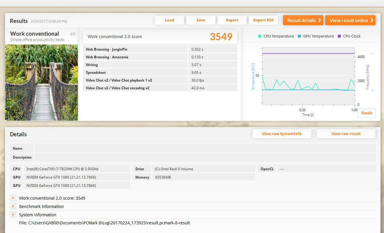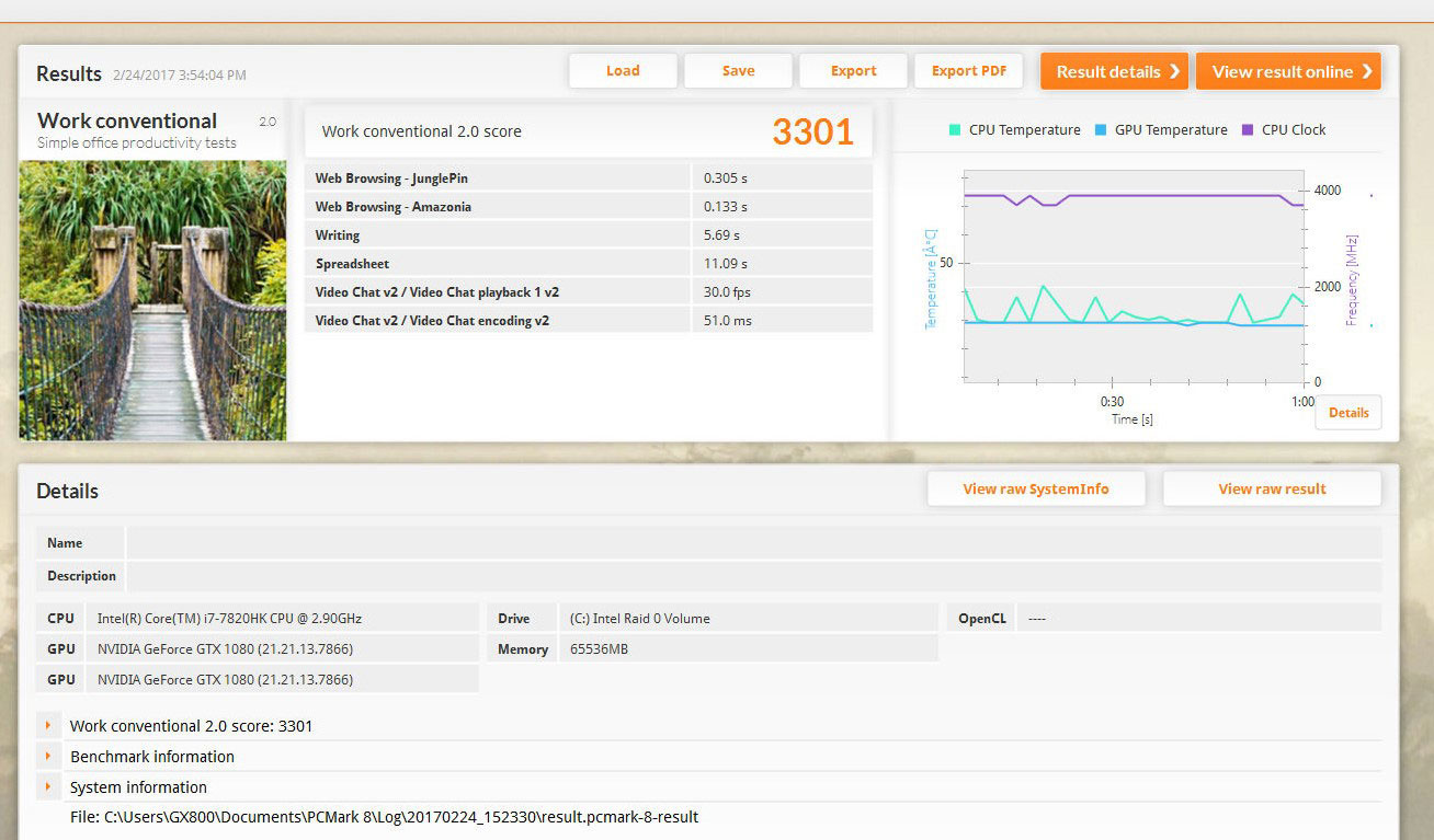 Hasilnya bisa diperoleh dari berbagai macam uji aplikasi untuk mengetahui performa dari laptop. Berikut hasil benchmark untuk ASUS ROG GX800. Benchmark ROG GX800 dilakukan ketika modenya ditingkatkan, dari standar menuju optimized dan ekstrim, kemampuannya akan langsung meningkat. Sehingga kita bisa melihat hasil pengujian yang maksimal.