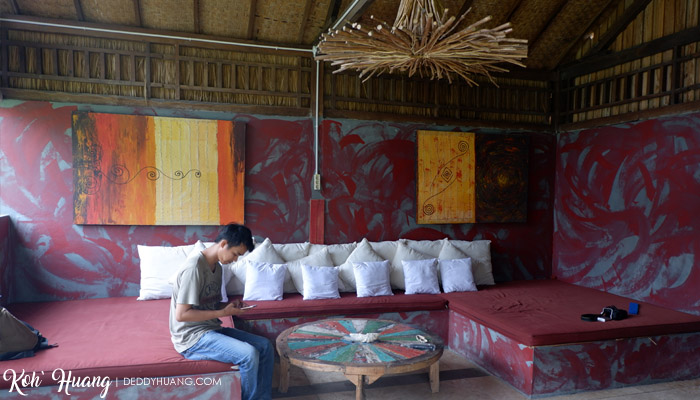 Kita bisa bersantai di area tamu dengan kursi sofa yang empuk hingga tertidur, selain itu interior di dalamnya juga dari kriya kayu yang menarik. Apalagi ada bale-bale besar yang langsung menghadap ke arah pantai membuat kami ingin mencoba bersantai sejenak, namun sayang sekali sudah ditempati oleh para bule-bule yang terlebih dahulu menempatinya.